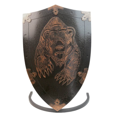 Подставка под шампуры и каминные принадлежности в виде щита с изображением “Медведь с лапами”.